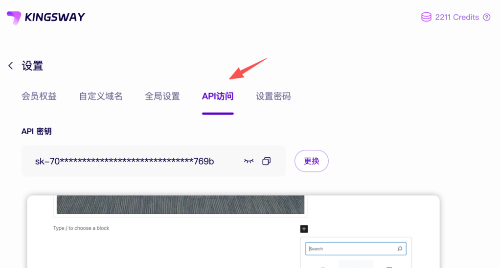 - 首次使用,需要配置 API Key,从后台的API 访问中获取