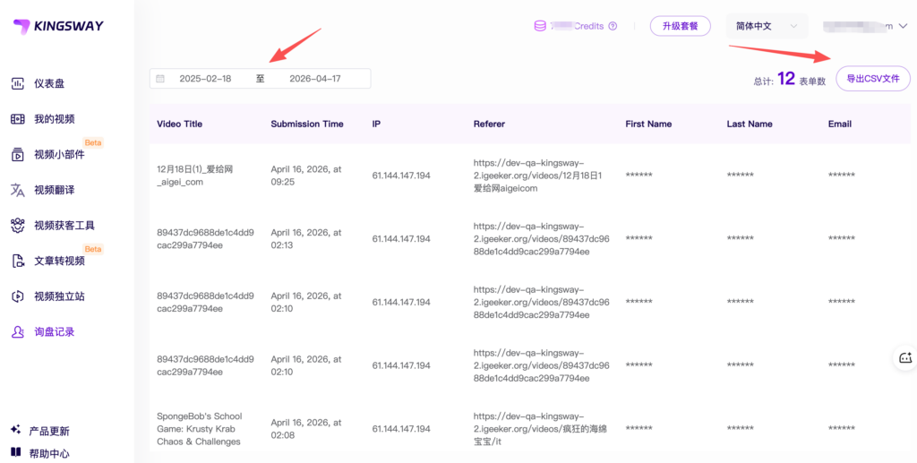 场景:在Kingsway 后台记录的询盘,希望能导出来,用于进一步做线索录入CRM 和分配,手动复制不方便,现在可以根据时间段筛选,下载询盘记录到本地。