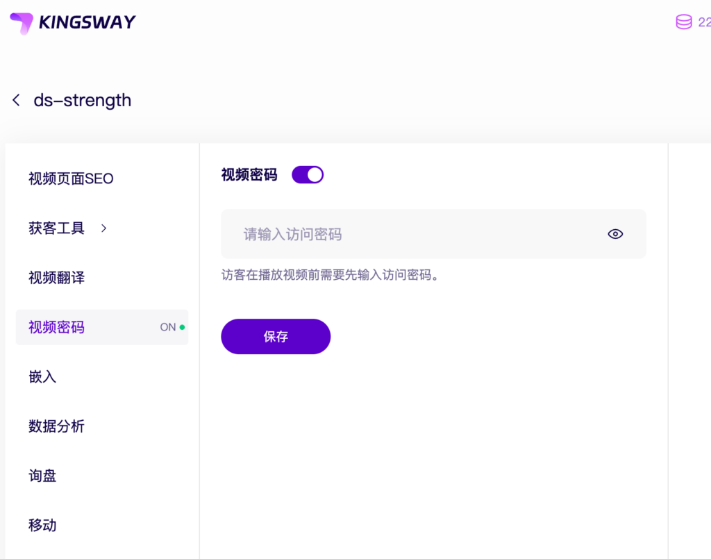场景:作为外贸企业,帮客户打样生产,或者有些视频内容不宜公开,需要输入密码后才能观看,可使用 视频密码 功能。设置密码后,需要对方也知道密码,输入验证后才能观看。