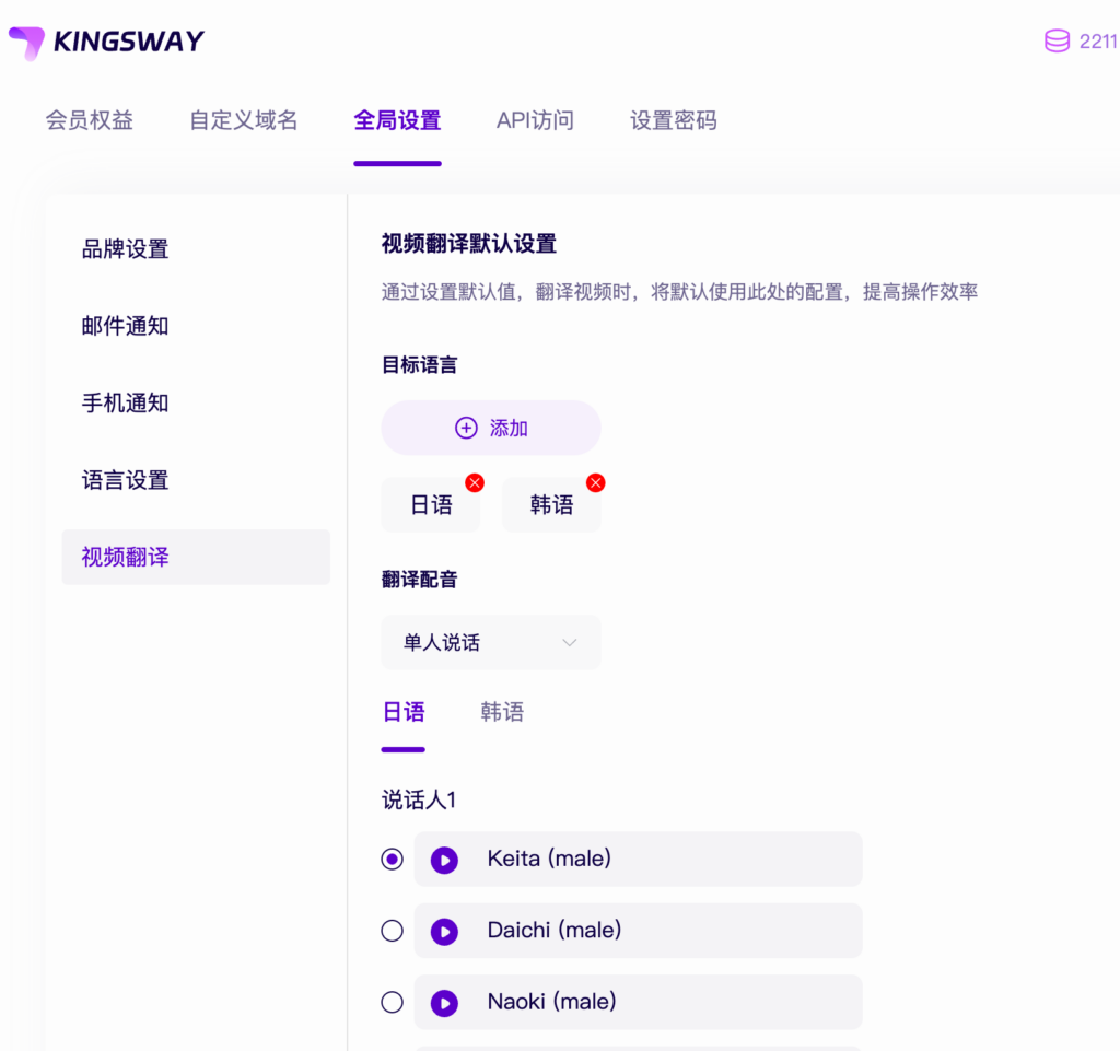 - 视频翻译支持全局默认设置,可提前设置好目标语言、音色等,新上传的视频如需翻译,默认使用全局设置,也可在单次翻译中修改