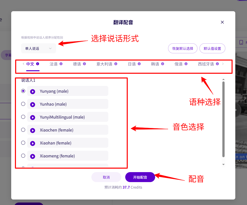 如果您需要视频配音,点击翻译配音,设置对应的配音设置