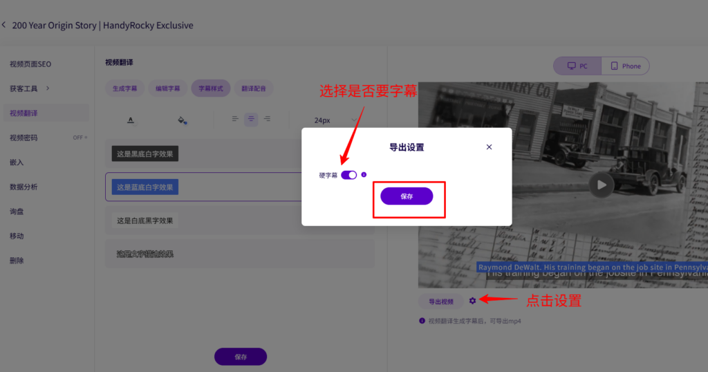 点击设置按钮,选择是否导出要硬字幕(即下载带有字幕):