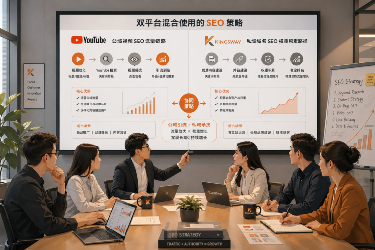 视频 SEO:YouTube/TikTok 发布产品视频,引导至 Shopify 产品页。用Kingsway促使Google 搜索结果中视频内容以富媒体形式展示(缩略图 + 时长),比普通文字结果更吸引点击。