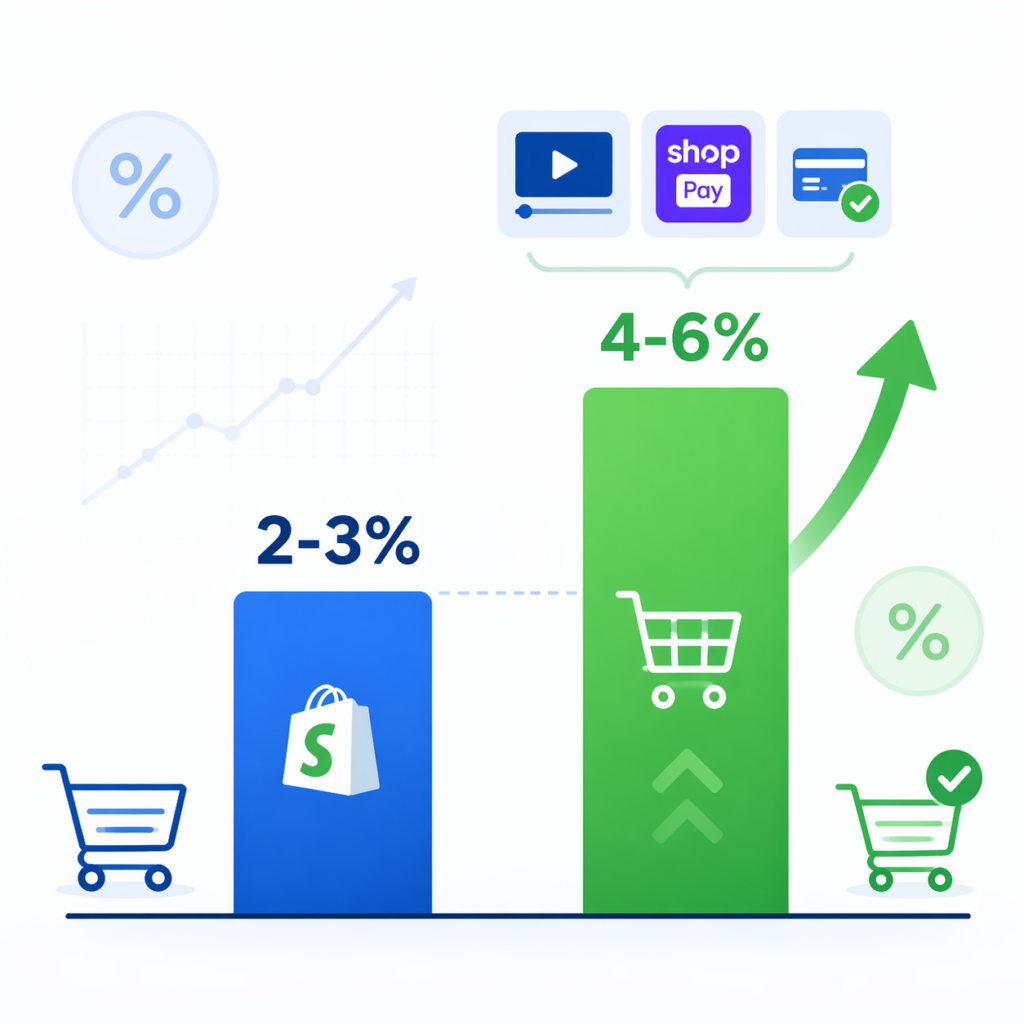 A: Shopify 平均转化率约 2-3%(Shopify 官方)。新站 1.5-2% 属正常,优化后可达 4-6%。品类差异大:美妆 3-4%,服装 2-3%,电子 1.5-2%。